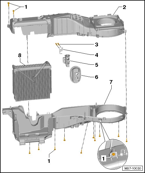 - Remove the evaporator housing from the heater and A/C unit. Refer to => [ Heater and A/C Unit Overview ] Heater and A/C Unit Overview.