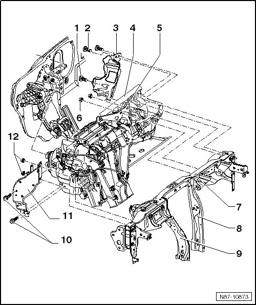 - From inside the engine compartment, remove the bolts - 1 - from the refrigerant pipes - 2 -.