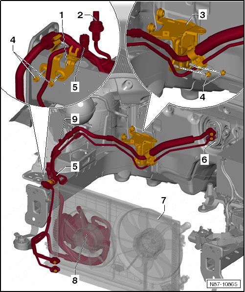 • Low pressure side, removing and installing, refer to => [ Evacuating and Charging Valve, Low and High Pressure Sides ] Evacuating and Charging Valve, Low and High Pressure Sides.