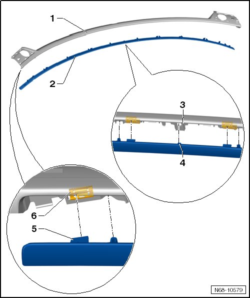 - Loosen all the tabs - 5 - on the decorative strip - 2 - out of the retainers - 6 - using trim removal wedge (3409) , starting from the outside.