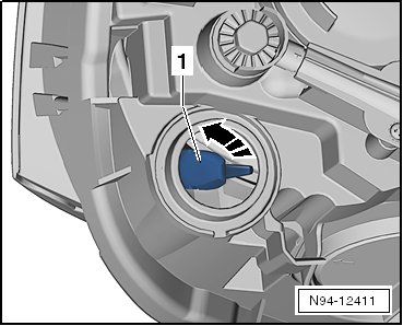 - Turn the bulb socket - 1 - in - direction of arrow - and remove from the headlamp together with the left front side marker lamp bulb (M33).