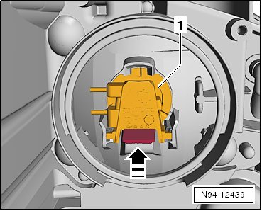 - Move the release in - direction of arrow - and unclip the bulb socket - 1 - and left high beam headlamp bulb (M30) from the headlamp.-