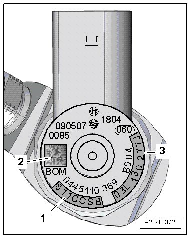 The 7 digit correction values - 1 - are stamped on each injector. The specification in the illustration is just an example. The stamped values can be letters and/or numbers.