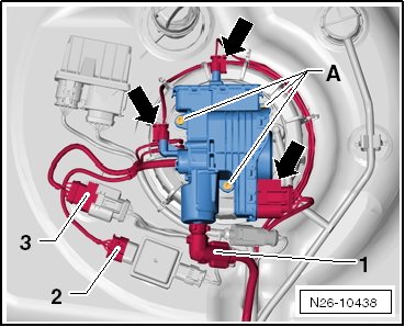 - Connect the connectors - arrows - to the reducing agent pump and connect the delivery line - 1 -.