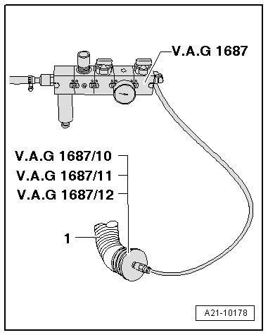 - Connect the testing unit for turbocharger (V.A.G 1687) as shown, to the adapter (1687/12).