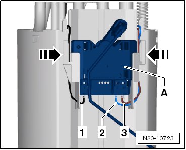 - Squeeze the tabs - arrows - and remove the fuel level sensor upward.