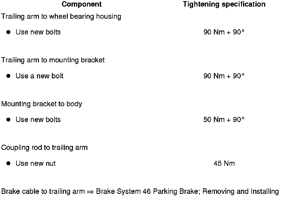 - Tighten the trailing arm bolts - arrows - to the tightening specification. Make sure each component is in its correct position => [ Position: Threaded connection of trailing link/wheel bearing housing ].