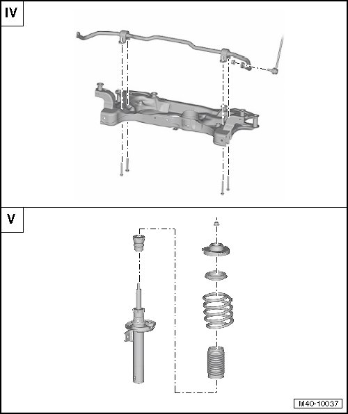 • Bonded rubber bushings can only be turned to a limited extent. Therefore, the threaded connections of the components with bonded rubber bushings should only be tightened when the wheel bearing housing is lifted (curb weight position).