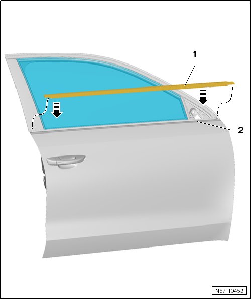 - Remove the outer window shaft strip - 1 - from the door flange - 2 - in - direction of arrow -.