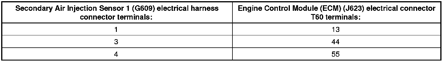 - Using a multimeter, check the Secondary Air Injection Sensor 1 (G609) electrical harness connector terminals to the Engine Control Module (ECM) (J623) electrical harness connector T60 terminals for an open circuit. Refer to Wiring Diagrams for pin locations.