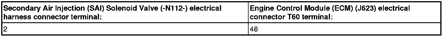 - Using a multimeter, check the Secondary Air Injection (SAI) Solenoid Valve (-N112-) electrical harness connector terminal 2 to the Engine Control Module (ECM) (J623) electrical harness connector T60 for an open circuit.