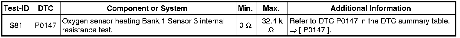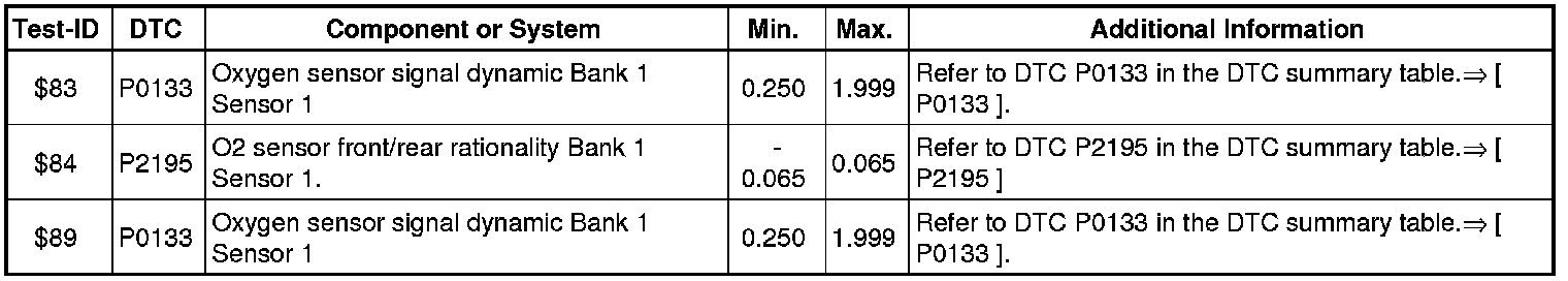- If any of components or systems fail to meet the specified values. Refer to Diagnostic "Mode 03: Interrogating Fault Memory" to check for stored DTC's or the corresponding diagnostic repair procedure => [ Diagnostic Mode 03 - Read DTC Memory ] Diagnostic Mode 03 - Read DTC Memory.