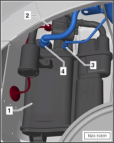 - Disconnect the lines - 3 and 4 - from the Evaporative Emission (EVAP) canister - 1 -. Refer to => [ Coupling, Disconnecting ] Coupling, Disconnecting.