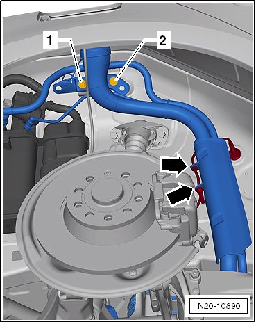 - Disconnect the black supply line - 1 - and the white vent line - 2 -. Refer to => [ Coupling, Disconnecting ] Coupling, Disconnecting.