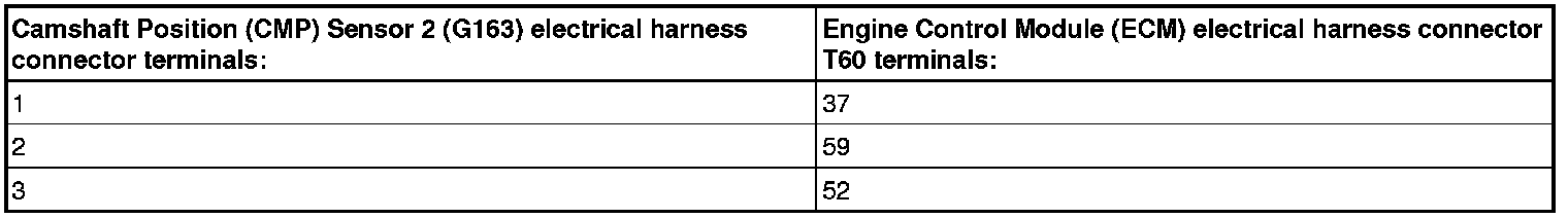 - Using a multimeter, Check the Camshaft Position (CMP) Sensor 1 (G40) or Camshaft Position (CMP) Sensor 2 (G163) electrical harness connector to the Engine Control Module (ECM) electrical harness connector T60 for an open circuit.