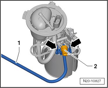 - Disconnect the fuel line - 2 - from the fuel delivery unit flange - 3 - and wipe up any leaking fuel with a cloth. Refer to => [ Coupling, Disconnecting ] Service and Repair.