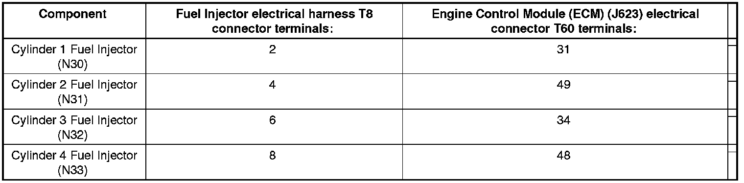 - Check for an open or high resistance in the circuit between the T8 connector and the injector that was out of specification. If no fault is found in the circuit, replace the injector. Refer to the Repair Information.