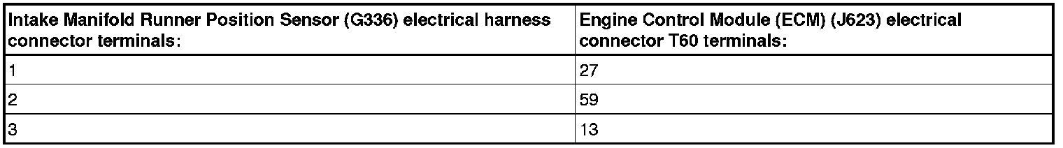 - Using a multimeter, check the Intake Manifold Runner Position Sensor (G336) electrical harness connector terminals to the Engine Control Module (ECM) (J623) electrical harness connector T60 terminals for an open circuit.