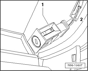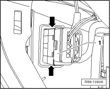 - Press both retaining tabs - arrows - together and slide Front Passenger Airbag -Off- Key Switch - 1 - inward through glove compartment.