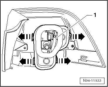 - Open the tabs - arrows - and remove the bulb holder - 1 - from the tail lamp housing. Pay attention to the wires still connected.