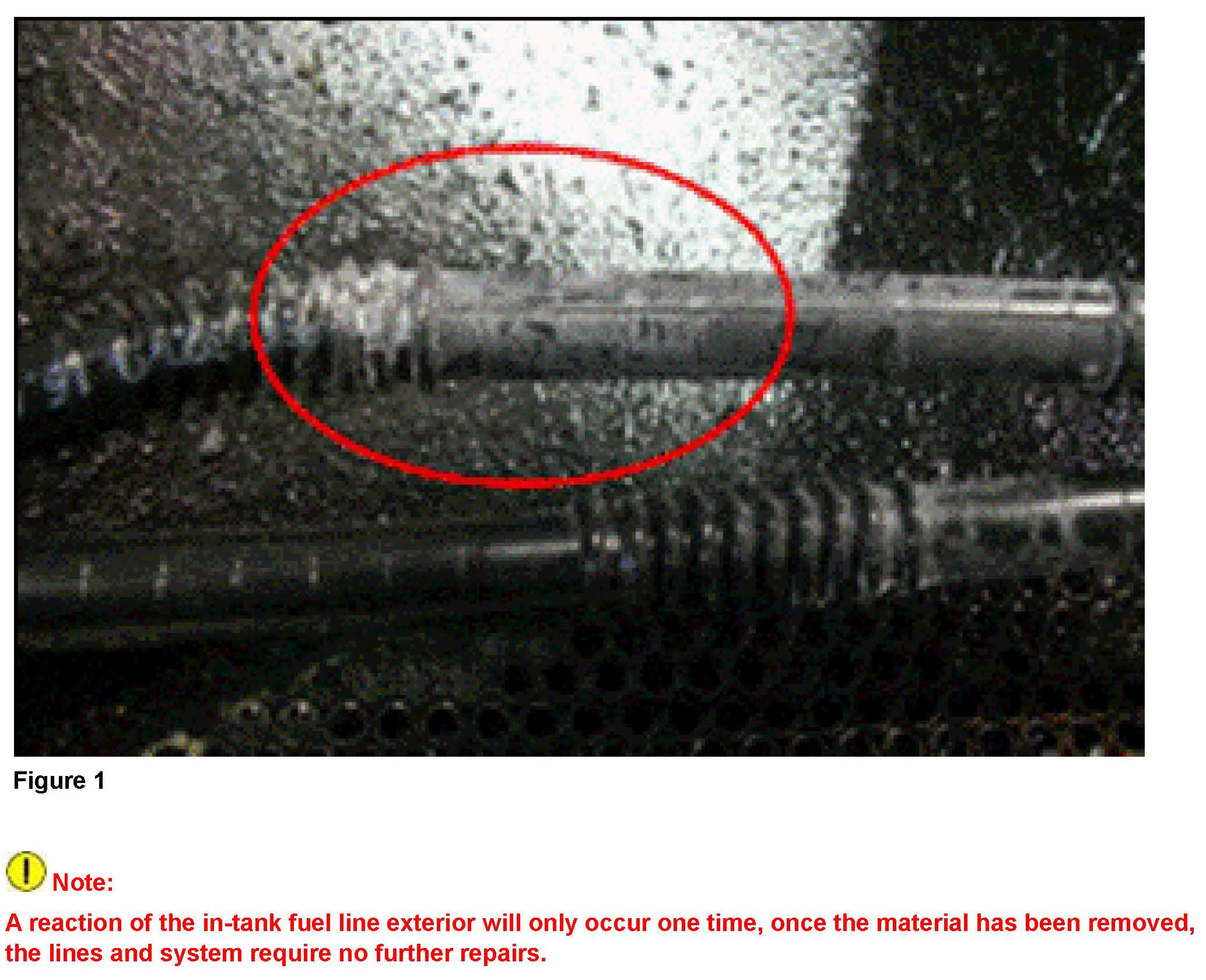 A reaction of the in-tank fuel line exterior will only occur one time, once the material has been removed, the lines and system require no further repairs.