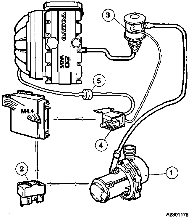 Motronic 4.4 MFI controls the pulsed secondary air injection system (PAIR) pump valve and solenoid for the pulsed secondary air injection system (PAIR) using separate outputs from the engine control module (ECM). The pulsed secondary air injection system (PAIR) is activated 20 seconds after the engine is started if engine temperature is between -12°C and +35°C. After that the system remains active for 60-100 seconds depending on engine temperature. If car speed is below 10 km/h after 20 seconds, only the pulsed secondary air injection system (PAIR) valve is activated. The pulsed secondary air injection system (PAIR) pump only starts when car speed exceeds 10 km/h and operates until the pulsed secondary air injection system (PAIR) is deactivated, regardless of whether car speed drops below 10 km/h.