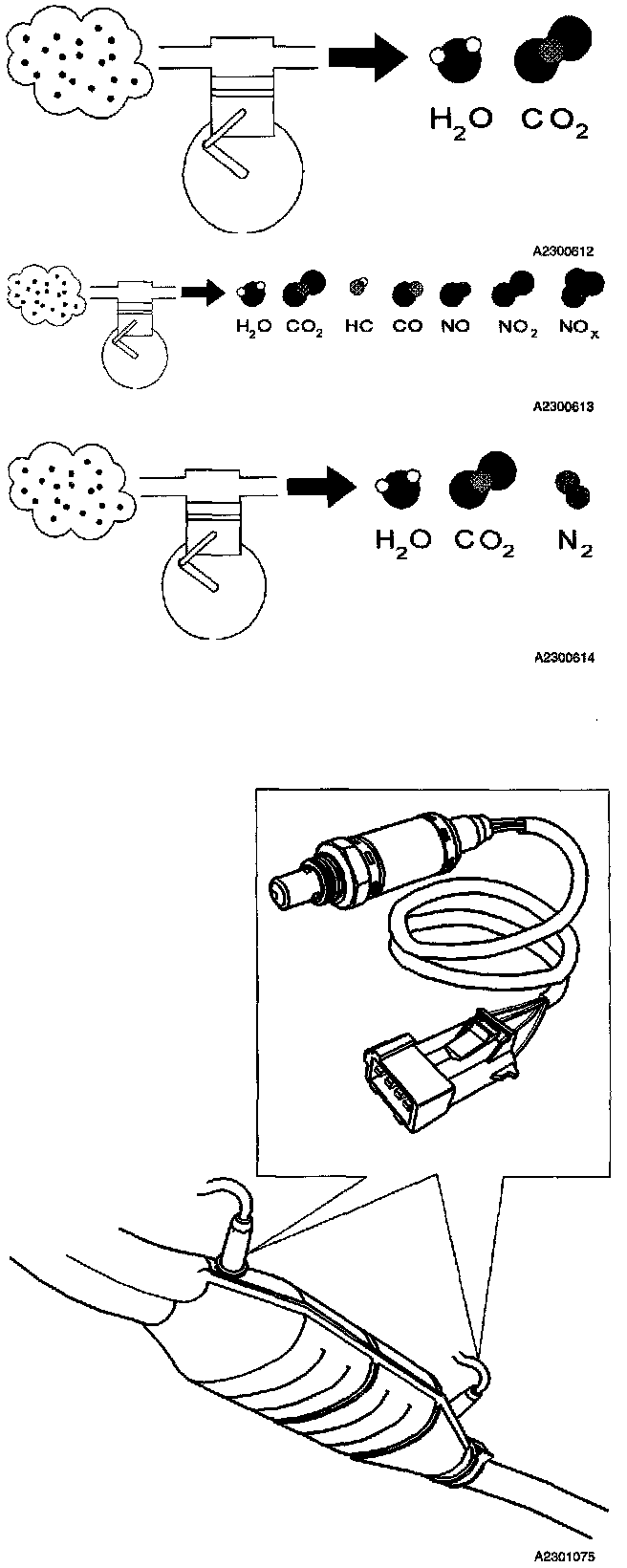 However, this is only possible if there is the exact balance of hydrocarbons, carbon monoxide, oxygen (02) and nitrogen oxides in the exhaust gases. This occurs when the fuel/air mixture prior to combustion is 14.7 kg air per 1 kg fuel. This is said to represent a value of lambda equals one, (Lambda = 1).