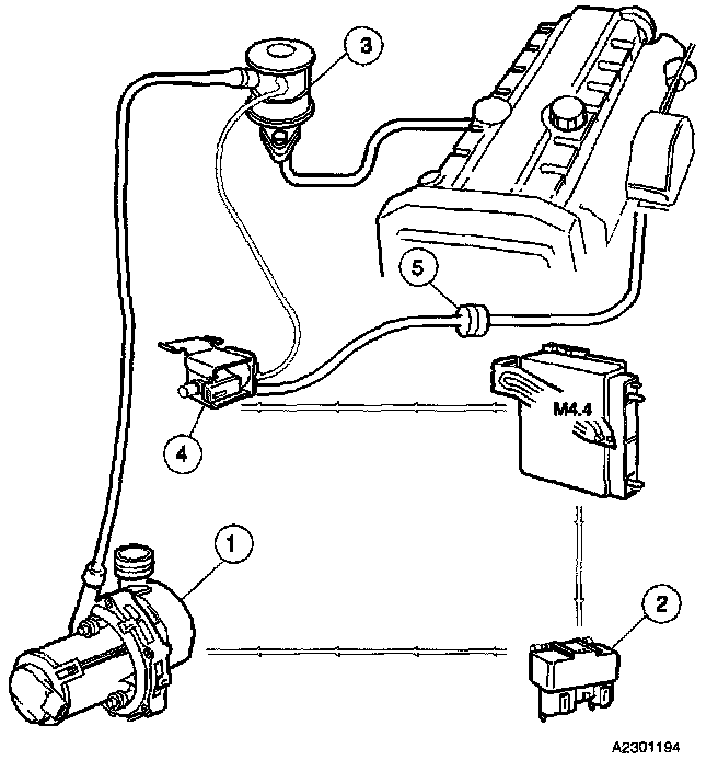 Motronic 4.4 controls the pulsed secondary air injection system pump relay and solenoid valve via separate outputs in the engine control module. The pulsed secondary air injection system is activated 12 seconds after the engine is started if engine temperature is between -11°C (-12.2°F) and +35°C (+95°F). After that the system remains active for 70 seconds.