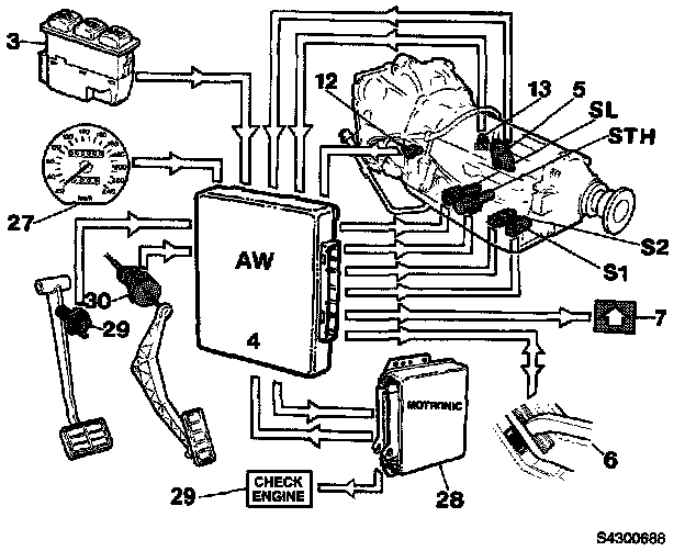 The control module orders gear-shifts by sending shift signals to two shift solenoid valves (S1, S2) incorporated in the transmission. Depending on the signals the transmission control module receives the torque converter lock-up is activated. Lock-up is controlled by the lock-up solenoid (SL).