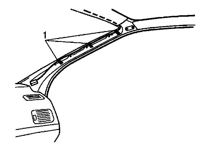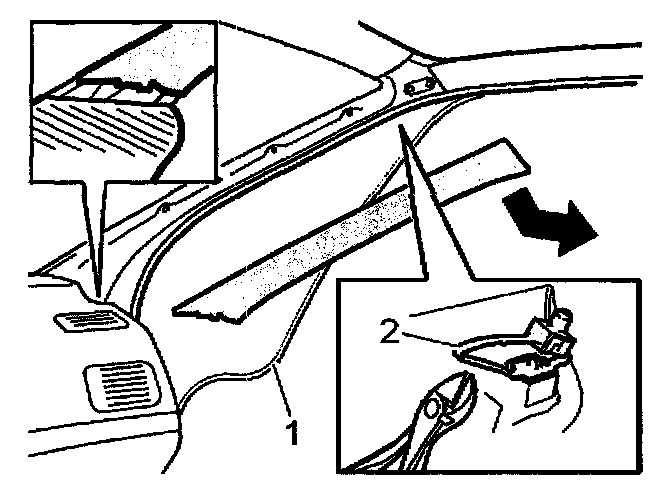 - Install the new antenna. Carefully bend the headlining downward and slide the antenna backward and inwards. Align the antenna lugs (1) with the grooves in the bracket (2)