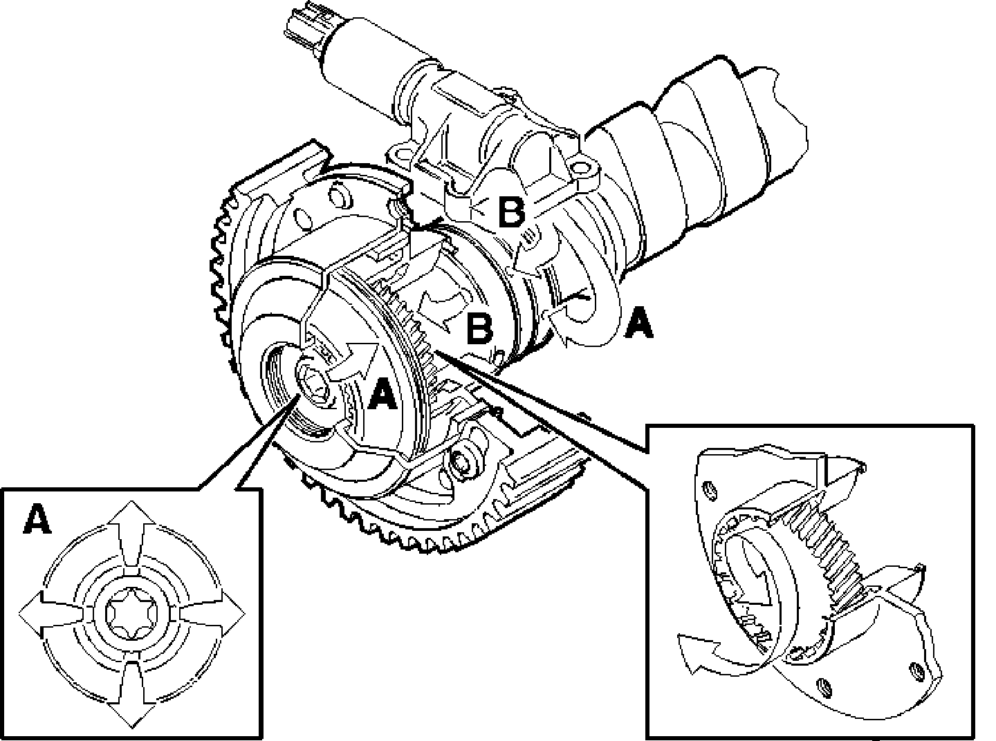 The variable camshaft is hydraulically controlled by the engine oil. The camshaft turns when the camshaft reset valve (CVVT) releases lubricating oil into the front (A) or rear chamber (B) of the CVVT unit. The chambers are separated by a piston which is secured in the camshaft. The piston is secured in the cover of the CVVT unit by splines so that it moves easily. When the oil acts on the piston, the piston twists. The pulse wheel for the timing belt is on the outer cover of the CVVT unit.