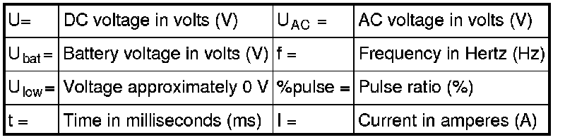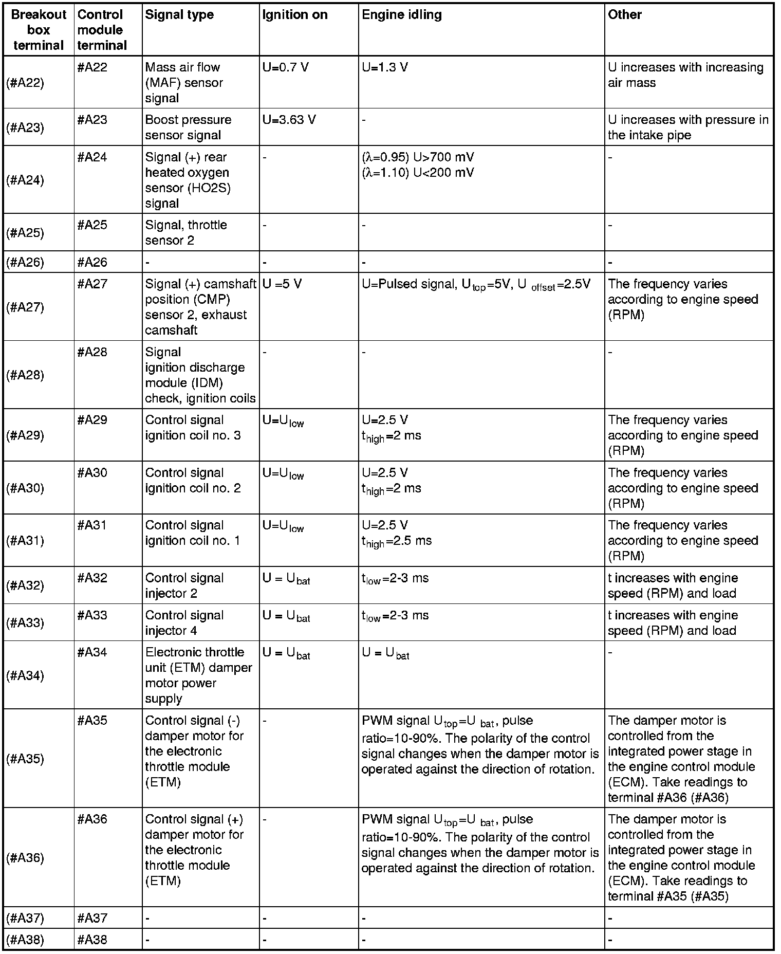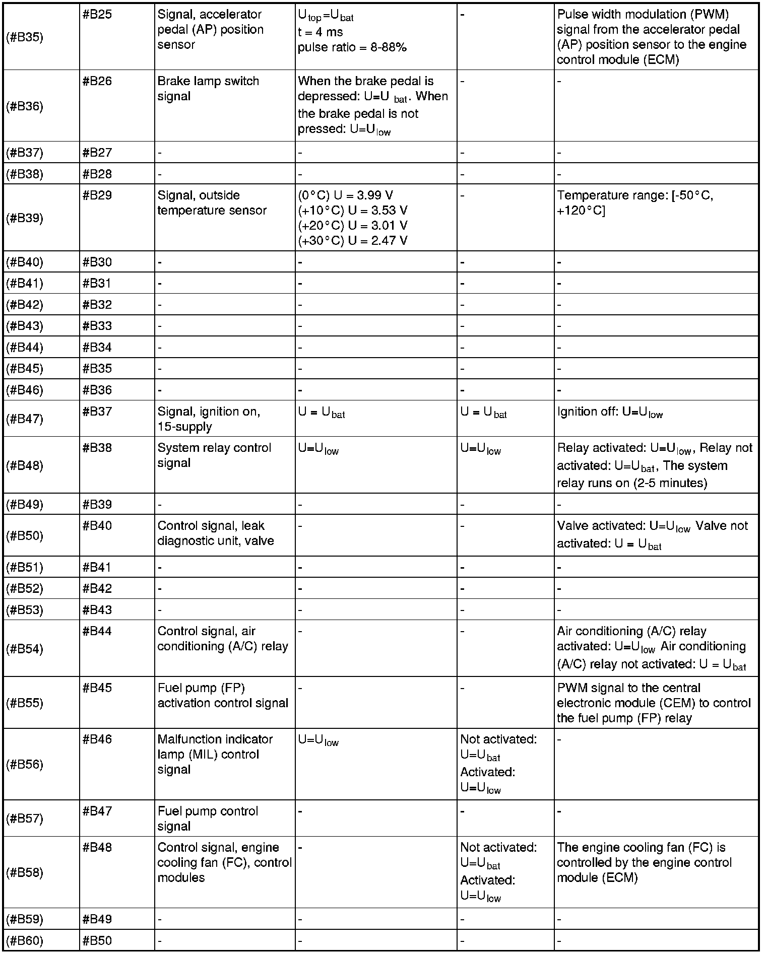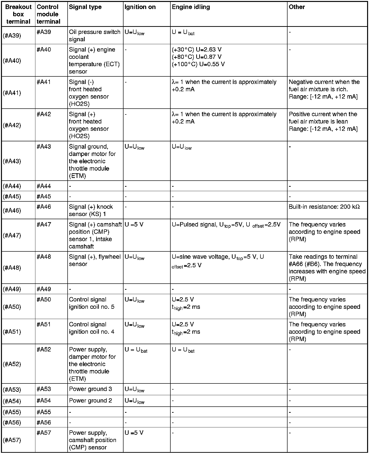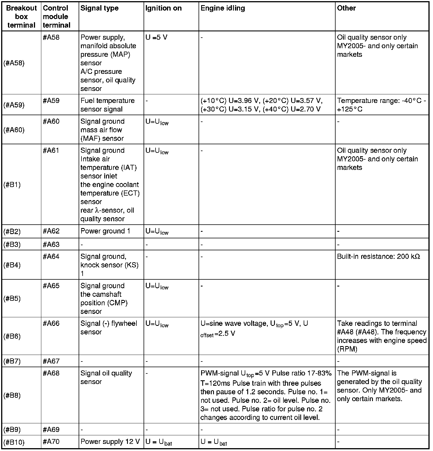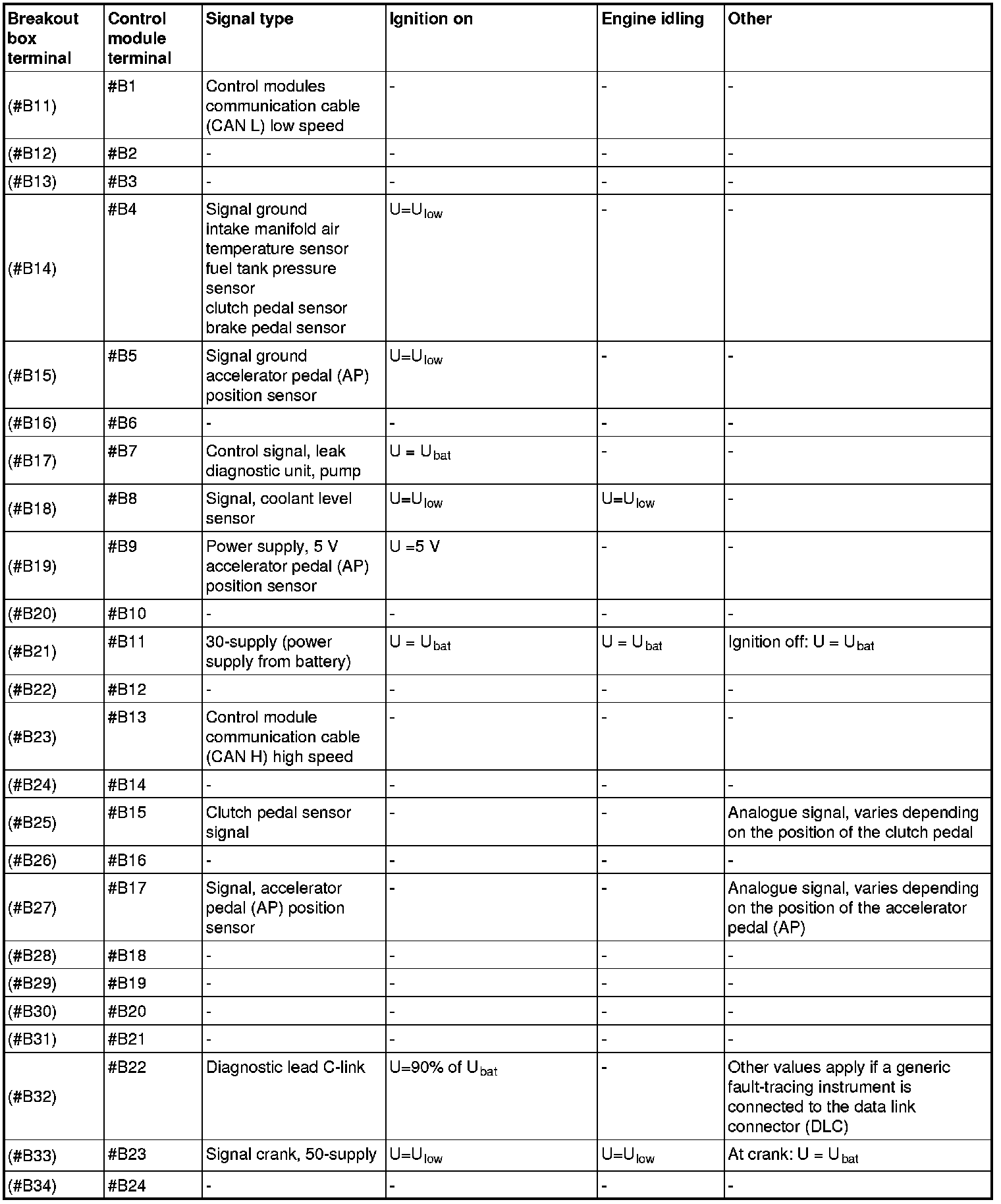 All values listed below should be measured between the respective terminal in column 2 (control module terminal) and terminal #B2 unless stated otherwise in column 6 (Other).