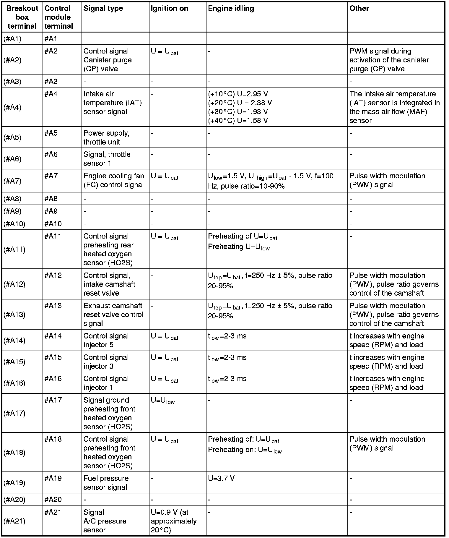 Hint: If the numbering of the connector is different from the numbering on the breakout box, the connector number is given first, terminal #A61, followed by the breakout box number in brackets, (terminal #B1). Example: #A61 (#B1).