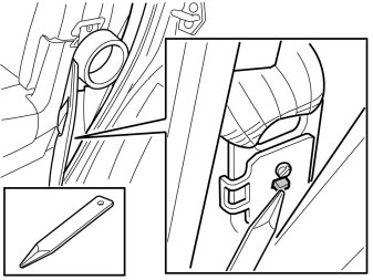 - Loosen the upper part of the sill moulding on the rear edge and loosen the seat belt from the end fitting. The belt is loosened by carefully pressing with a weatherstrip tool on the lock lug so that the seat belt releases from the end fitting.