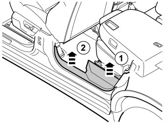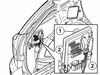 - Remove the Rear Electronic Module (REM) by opening the lock (1) on the top of the unit. Tip the unit forward and lift it out of the mountings (2).