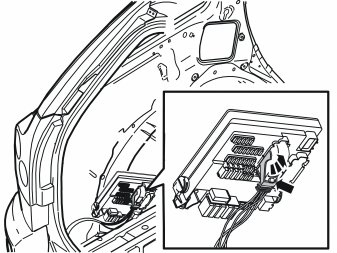 - Press in the catch on the rear brown connector in the fuse holder in the cargo compartment, turn the lock arm up as far as it will go and pull out the connector.