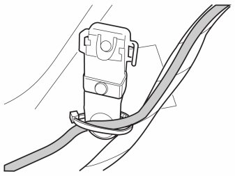 - Install the strip clamp around the cable harness by the yellow marking and press to fasten the clamp on the parking brake console's flange.