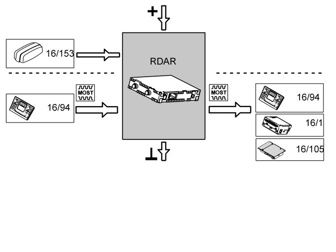 The control module has serial optical communication with other components in the MOST network. This means that all communication with Remote Digital Audio Receiver (RDAR) occurs via the Infotainment control module (ICM) or on the initiative of the Infotainment control module (ICM).