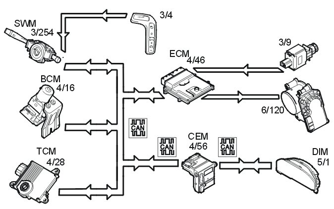 The driver activates the function by pressing the SET+ or SET- button. A message is then transmitted via the low speed side of the Controller area network (CAN) to the central electronic module (CEM) which then transmits the message on via the high speed side of the Controller area network (CAN) to the engine control module (ECM).