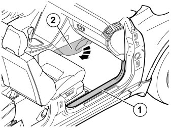 - Loosen the sill panel (1) and the right panel (2) of the centre console.