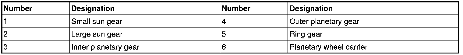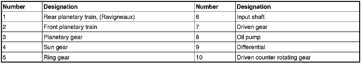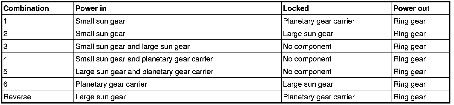 The ratios are obtained through different combinations of locked and/or connected components. The table displays the principle for how the ratios are obtained from large ratio, 1, to small ratio, 6, and counter rotation (i.e. reverse with large ratio).