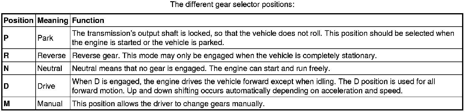 Gear selector assemblies with Geartronic, in addition to P/R/N/D modes, have a manual (M) shifting mode. The manual gear positions can be selected at any point while driving. The engaged gear is locked until the driver selects another gear. The automatic transmission only down shifts if the vehicle slows down to very low speed. To downshift the gear selector must be moved to minus (-). To upshift the gear selector must be moved to plus (+). At start, 3rd is the highest possible gear.