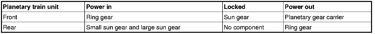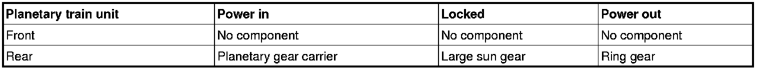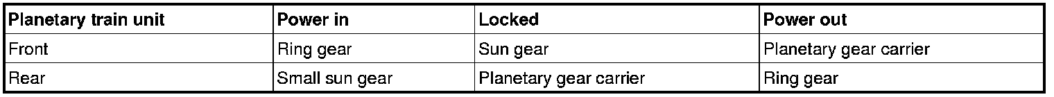 The rear planetary train's ring gear rotates clockwise. Because the rear planetary train's outer planetary gear rotation is added to the rear planetary gear carrier's rotation, the ring gear's speed is greater than the speed at the planetary carrier.