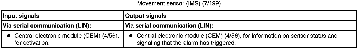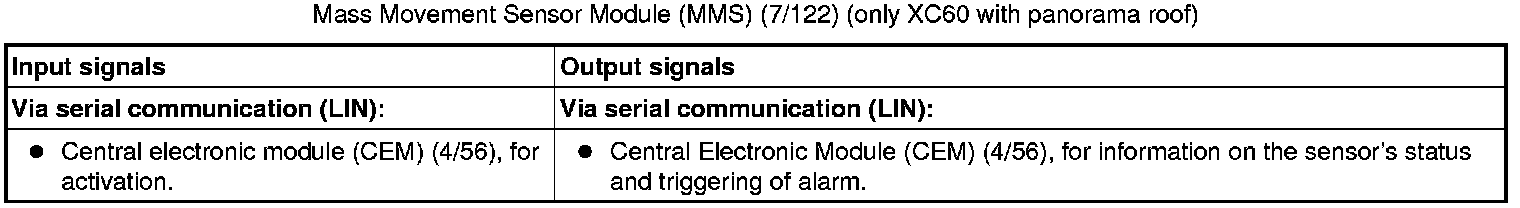 The tables below summarize the input and output signals to the units in the system for the alarm. The signal types are divided into directly connected signals, serial communication and controller area network (CAN) communication.
