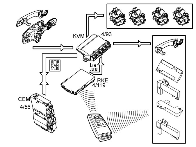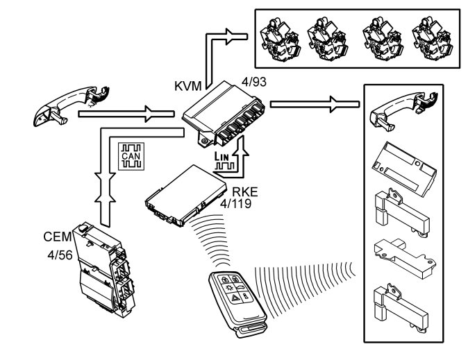 When the contact breaker in the handle is closed, the keyless vehicle module (KVM) activates the antennas in the handle on the rear doors on the side on which the handle was pulled out. A request is transmitted via the antenna to the passive remote key. The remote key transmits an encrypted response which is received by the remote keyless entry (RKE) receiver. The remote keyless entry (RKE) receiver checks that the received signal is from a Volvo remote key. If it is, the message is forwarded to the keyless vehicle module (KVM). The keyless vehicle module (KVM) decrypts the signal and compares the received code from the remote key with its own programmed codes. If these correspond, the keyless vehicle module (KVM) transmits two signals. One signal is transmitted to the quick lock, in the door on which the handle was pulled out, to unlock and open the door. The other signal is transmitted to the central electronic module (CEM) which unlocks the other doors, depending on the system settings. The settings are: