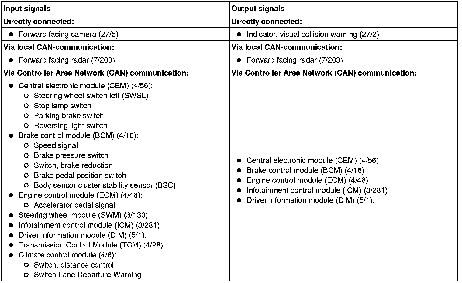 The table below summarizes the input signals to and output signals from the Forward Sensing Module (FSM). The signal types are divided into directly connected signals, serial communication and controller area network (CAN) communication. The illustration below displays the same information with the Volvo component designations.
