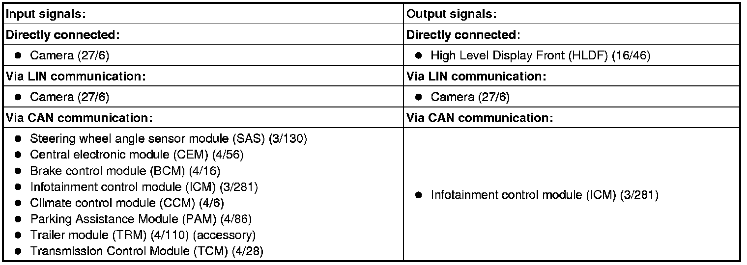 The table below summarizes the input signals to and output signals from the Parking Assistance Camera (PAC). The signal types are divided into directly connected signals, LIN communication and controller area network (CAN) communication. The illustration below displays the same information with the Volvo component designations.