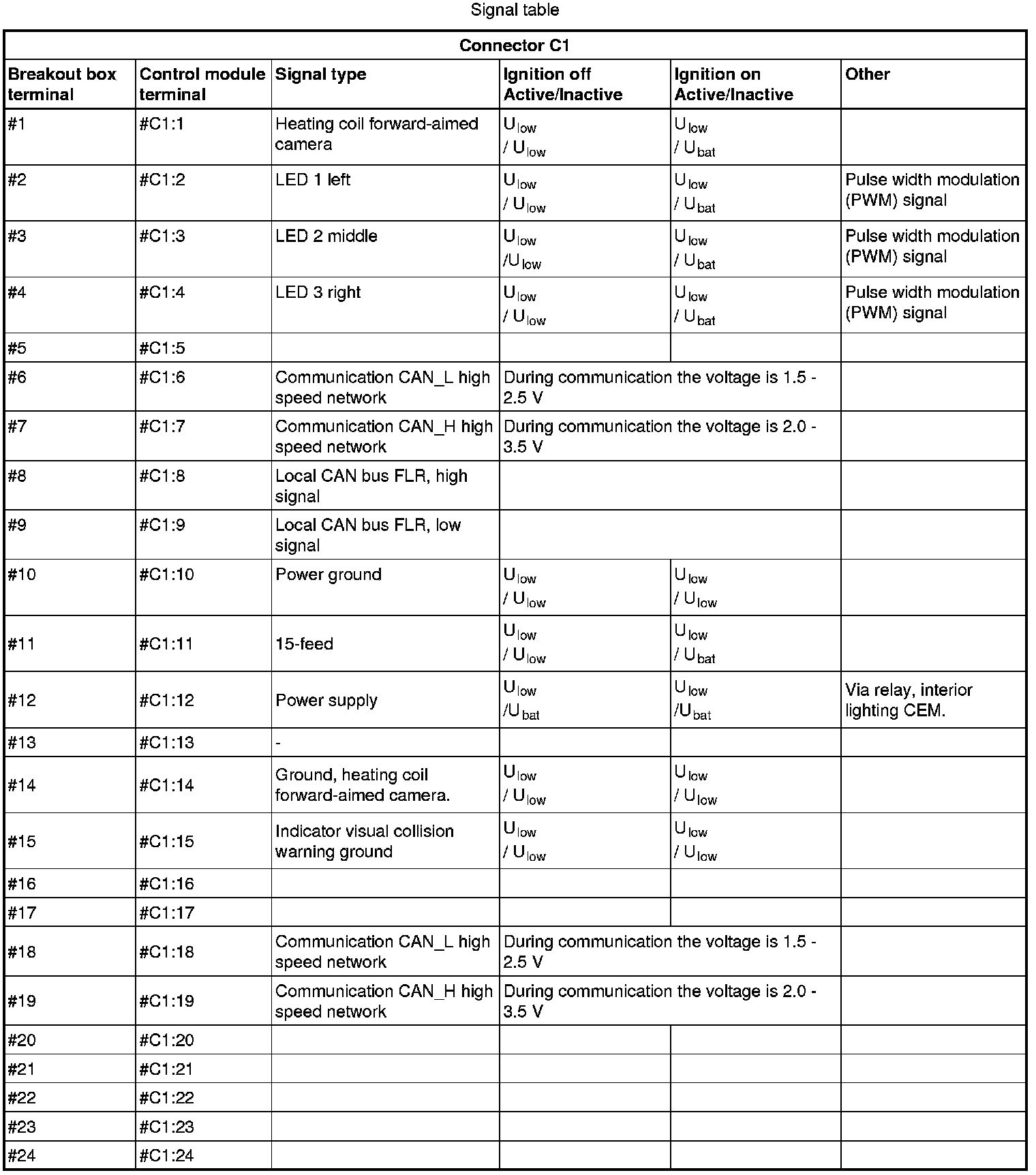 All the values given below are between the respective terminal in column 1 and terminal #C1:10 in column 2 (power ground) unless otherwise stated in parenthesis after the table entry.