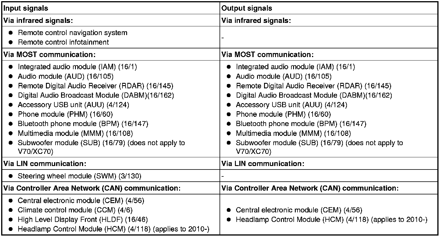 The table below summarizes the input signals to and output signals from the infotainment control module (ICM). The signal types are divided into infrared signals (IR), MOST communication, LIN communication and CAN communication. The illustration below displays the same information with the Volvo component designations.