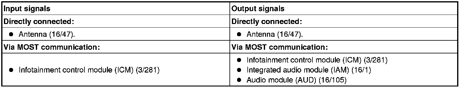 The table below summarizes the input signals to and output signals from the Remote Digital Audio Receiver (RDAR). The signal types are divided into directly connected signals and MOST communication. The illustration below displays the same information with the Volvo component designations.
